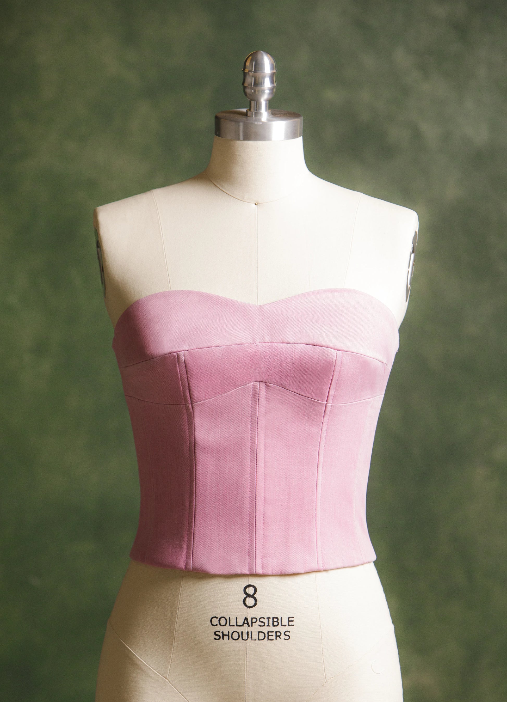 Corset de talle medio  con corte ondulado en pecho, confeccionado en  algodon, diseño straples, estructura de varilla interna, ajuste en espalda de ojillos con agujeta y zipper separable en lateral izquierdo.