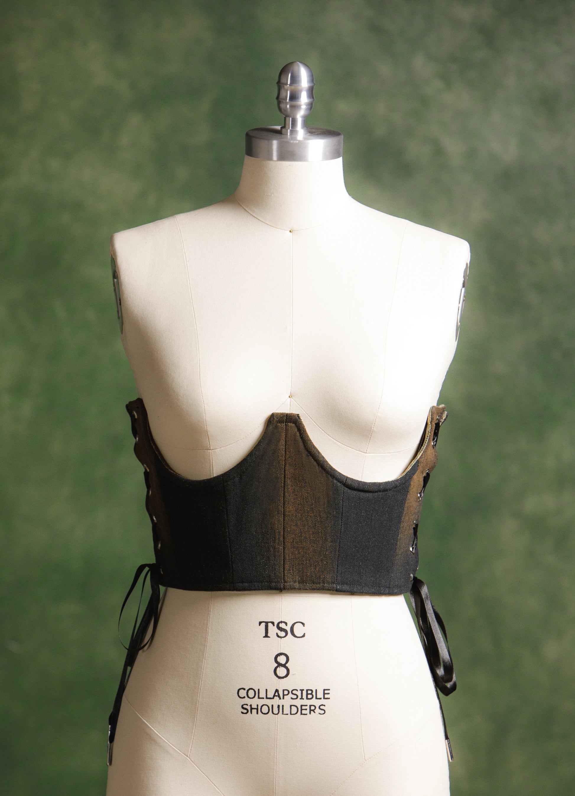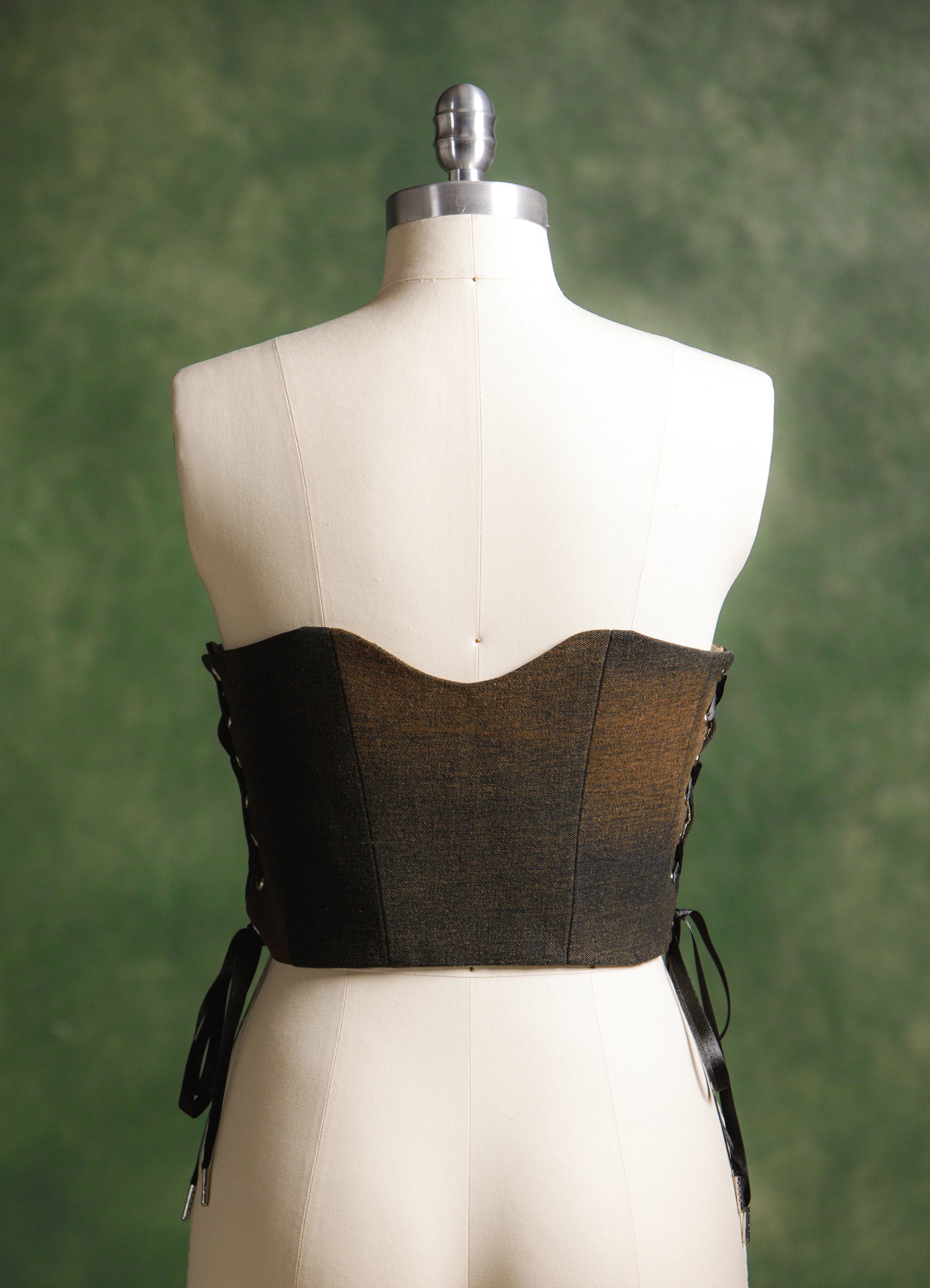 Corset corto bajo busto, confeccionado en algodon, estructura de varilla interna, ajuste en laterales de ojillos con agujeta.