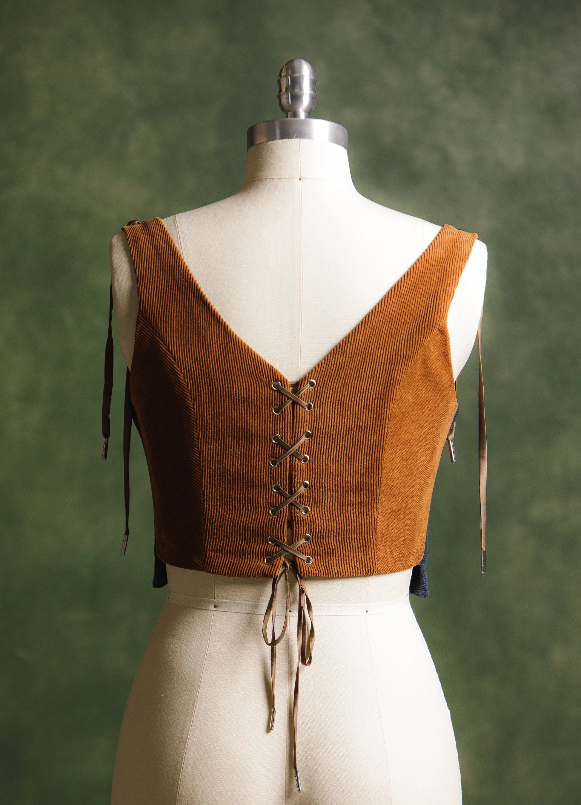 Corset de talle corto con corte recto en pecho, confeccionado en pana diseño con tirantes ajustables, estructura de varilla interna, ajuste en espalda de ojillos con agujeta y fajin frontal de ojillos con agujeta.