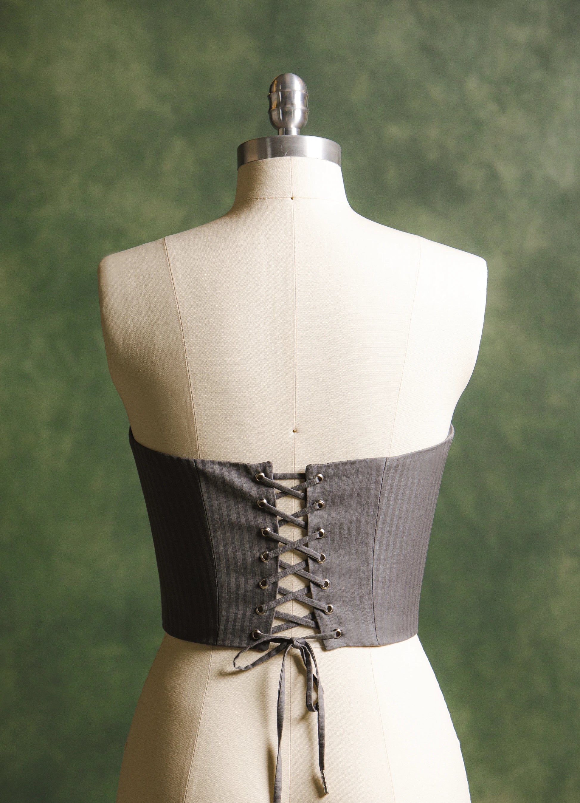 Corset de talle corto con cortes inclinados confeccionado en lana, diseño straples con interior forrado, estructura de varilla interna, ajuste en espalda de ojillos con agujeta.